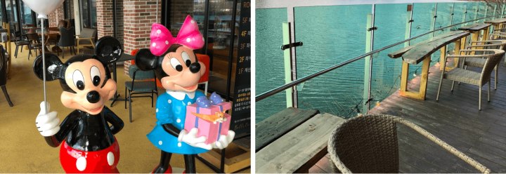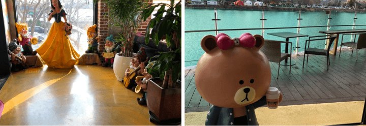 입구에서 반겨주는 디즈니 캐릭터 인형인 미키 마우스와 그의 여자 친구가 저희를 풍선과 함께 반기고 그 왼쪽에는 카카오에서 자주 보는 곰돌이 캐릭터인데 이름이 기억이 가물합니다. 그리고 미키마우스의 바로 왼쪽에는 강물이 흐르고 있는데 날씨만 더 따뜻해지면 앉아서 기타라도 치면서 잔잔한 음악을 부르고 싶어 지는 경치가 내 마음속의 지워졌던 감성을 불러일으켰습니다. 랄랄라~~~